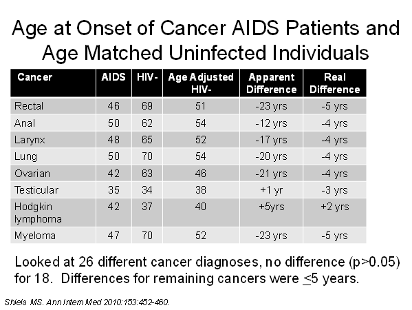 Another slide from a presentation given by Amy Justice at an HIV/AIDS conference in 2012. (Click the image to enlarge it.) It shows some of the key results from a study published in the Annals of Internal Medicine that corrected earlier research which drastically overestimated how much earlier people with HIV develop certain cancers, because it didn't properly take people's ages into account. |
