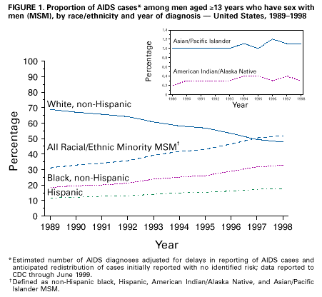 HIV/AIDS Among Racial/Ethnic Minority Men Who Have Sex with Men -- United States, 1989-1998January 14, 2000 A note from TheBody.com: Since this article was written, the HIV pandemic has changed, as has our understanding of HIV/AIDS and its treatment. As a result, parts of this article may be outdated. Please keep this in mind, and be sure to visit other parts of our site for more recent information! In the United States, racial/ethnic minority populations account for an increasing proportion of acquired immunodeficiency syndrome (AIDS) cases, including cases among men who have sex with men (MSM).(1) This report presents recent trends in AIDS incidence and deaths among MSM who belong to racial/ethnic minority populations(*) and compares data on human immunodeficiency virus (HIV) diagnoses with AIDS diagnoses during 1996-1998 among racial/ethnic minority MSM in the 25 states(**) that have conducted confidential HIV surveillance and AIDS case surveillance since 1994. The findings indicate that among MSM, non-Hispanic black and Hispanic men accounted for an increasing proportion of AIDS cases and had smaller proportionate declines in AIDS incidence and deaths from 1996 to 1998. Of HIV and AIDS diagnoses among racial/ethnic minority MSM, the proportion who are young (aged 13-24 years) is higher than among white MSM. Trends in AIDS incidence during 1989-1998 among MSM aged >13 years from the 50 states, the District of Columbia, and U.S. territories were analyzed by race/ethnicity, age, and geographic area of residence. During 1996-1998, AIDS incidence per 100,000 population was calculated using race/ethnicity-specific Bureau of the Census estimates of males aged >13 years for the corresponding years. The number of HIV infection and AIDS diagnoses and deaths among persons with AIDS was adjusted for reporting delays on the basis of cases reported to CDC through June 30, 1999, and for the anticipated reclassification of cases initially reported without HIV-infection risk-exposure data.(1) Trends examined were from 1989 through 1998 and from 1996 through 1998, the period of highly active antiretroviral therapy (HAART). During 1996-1998, for the 25 states with confidential HIV surveillance, age and race/ethnicity of MSM whose disease status was HIV infection (not AIDS) when initially diagnosed were compared with MSM who had AIDS-defining conditions when first diagnosed. Characteristics of MSM with AIDSThe five MSAs that accounted for the largest number of racial/ethnic minority MSM with AIDS during 1996-1998 were New York, 3673 (12%); Los Angeles, 2811 (9%); Miami, 1554 (5%); Washington, DC, 1251 (4%); and Chicago, 1075 (3%). New York and Los Angeles had the largest number of AIDS cases among non-Hispanic black and Hispanic MSM, respectively. Los Angeles and Phoenix were the MSAs with the largest number of AIDS cases among Asian/Pacific Islander (A/PI) and American Indian/Alaska Native (AI/AN) MSM, respectively, compared with New York for white MSM (Table 2). Trends in AIDS Incidence and Deaths Among MSM with AIDSDuring 1989-1998, AIDS was diagnosed in 290,582 MSM. In 1989, racial/ethnic minority MSM accounted for 24,444 (31%) AIDS cases among MSM, and by 1998, racial/ethnic minority MSM accounted for 18,153 (52%) AIDS cases among MSM (Figure 1). The proportion of MSM with AIDS who were non-Hispanic black and Hispanic increased from 19% and 12%, respectively, in 1989, to 33% and 18%, respectively, in 1998. A/PI and AI/AN each accounted for <2% of AIDS cases among MSM throughout this period. AIDS incidence among all MSM declined 22% from 1996 to 1997 (Table 1). The rate of decline slowed to 12% in 1998 compared with 1997. During 1996-1998, AIDS incidence declined among MSM in all racial/ethnic groups: A/PI (43%), non-Hispanic white (39%), AI/AN (35%), Hispanic (26%), and non-Hispanic black (23%). Overall, the proportionate declines in AIDS incidence from 1997 to 1998 were smaller than those from 1996 to 1997. From 1997 to 1998, AIDS incidence declined 29% among AI/AN, 17% among A/PI, 15% among non-Hispanic white, 10% among non-Hispanic black, and 9% among Hispanic MSM. Deaths among all MSM with AIDS declined 49% from 1996 to 1997 (Table 1). The rate of decline slowed to 23% in 1998 compared with 1997. From 1996 to 1998, AIDS deaths declined among all racial/ethnic MSM: A/PI (69%), non-Hispanic white (65%), AI/AN (63%), Hispanic (60%), and non-Hispanic black (53%). From 1997 to 1998, AIDS deaths declined 38% among AI/AN, 37% among A/PI, 24% among non-Hispanic white, 22% among Hispanic, and 21% among non-Hispanic black MSM. HIV and AIDS Diagnoses Among MSM in 25 Areas with HIV/AIDS SurveillanceDuring 1996-1998, HIV infection or AIDS was diagnosed in 23,680 MSM in 25 states with HIV reporting; 11,313 (48%) were racial/ethnic minority MSM: 9497 (40%) non-Hispanic black, 1551 (7%) Hispanic, 113 (<1%) A/PI, and 152 (<1%) AI/AN. Among MSM whose initial diagnosis was HIV infection, the proportion aged 13-24 years varied by race/ethnicity: 16% non-Hispanic black, 15% A/PI, 15% AI/AN, 13% Hispanic, and 9% non-Hispanic white. Among MSM whose initial diagnosis was AIDS, the proportion aged 13-24 years also varied by race/ethnicity: 6% Hispanic, 6% A/PI, 5% non-Hispanic black, 1% non-Hispanic white, and <1% AI/AN. Reported by: State and territorial health departments; Div of HIV/AIDS Prevention-Surveillance and Epidemiology, National Center for HIV, STD, and TB Prevention; and an EIS Officer, CDC. Editorial Note: These HIV/AIDS surveillance data highlight the importance of increased efforts to promote HIV prevention and treatment services in racial/ethnic minority communities, particularly among non-Hispanic black and Hispanic MSM. Percentage These groups had higher AIDS rates and the smallest proportionate decreases in AIDS incidence. The annual number of AIDS cases remains high, although AIDS incidence and deaths have declined among racial/ethnic minority MSM. Threse declines reflect the beneficial impact of H
